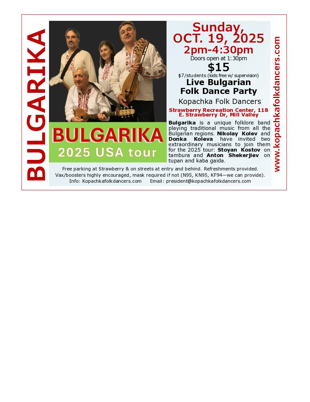 1:30pm Doors open 2 - 4:30pm Live Balkan Dance Party with BULGARIKA